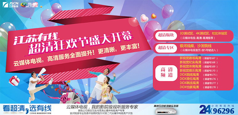 江蘇有線聯合美國杜比實驗室推出杜比體驗區,設有“環繞立體聲影廳”、“音樂 會”、“美國杜比實驗室”、“杜比好聲音”四大版塊,精選影視大片、多場live音樂 會,通過機頂盒與用戶家支持5.1聲道的音響設備,確保五個分離聲道和一個低頻聲 道,高保真還原現場音效,為您帶來云中夢幻享受。